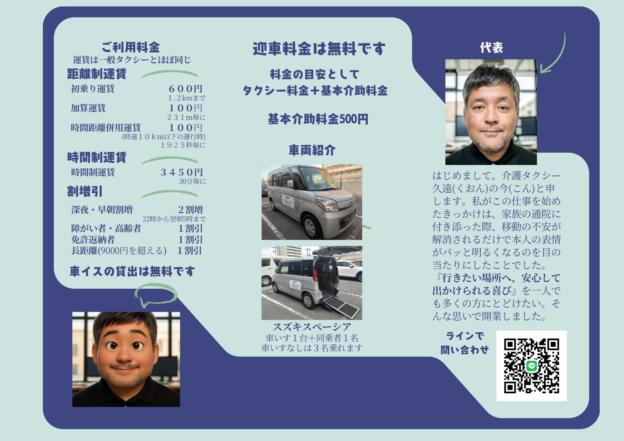 介護タクシー久遠(くおん)の外出支援サービスは、あなたの『行きたい場所』への架け橋です。通院はもちろん、お孫さんの結婚式や友人とのランチ、お墓参りなど、どんな目的でもご利用いただけます。
